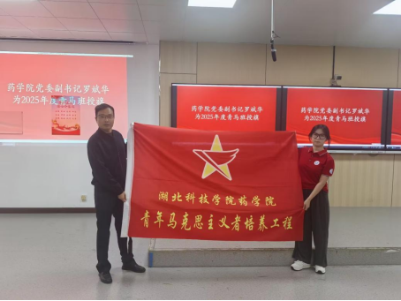 在授旗环节,药学院党委副书记罗斌华将印有“湖北科技学院药学院青年马克思主义者培养工程”字样的班旗郑重授予青马班。鲜红的旗帜象征着传承与使命,也标志着2025年青马班正式启航。